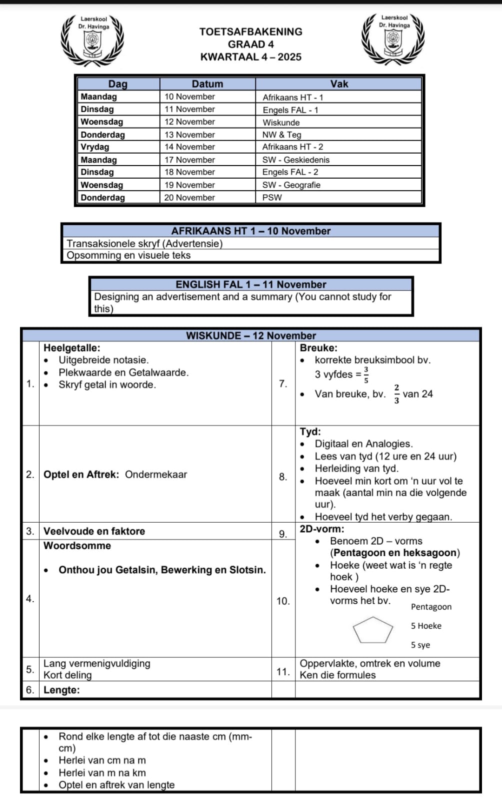 π Graad 4β7 Toetsrooster